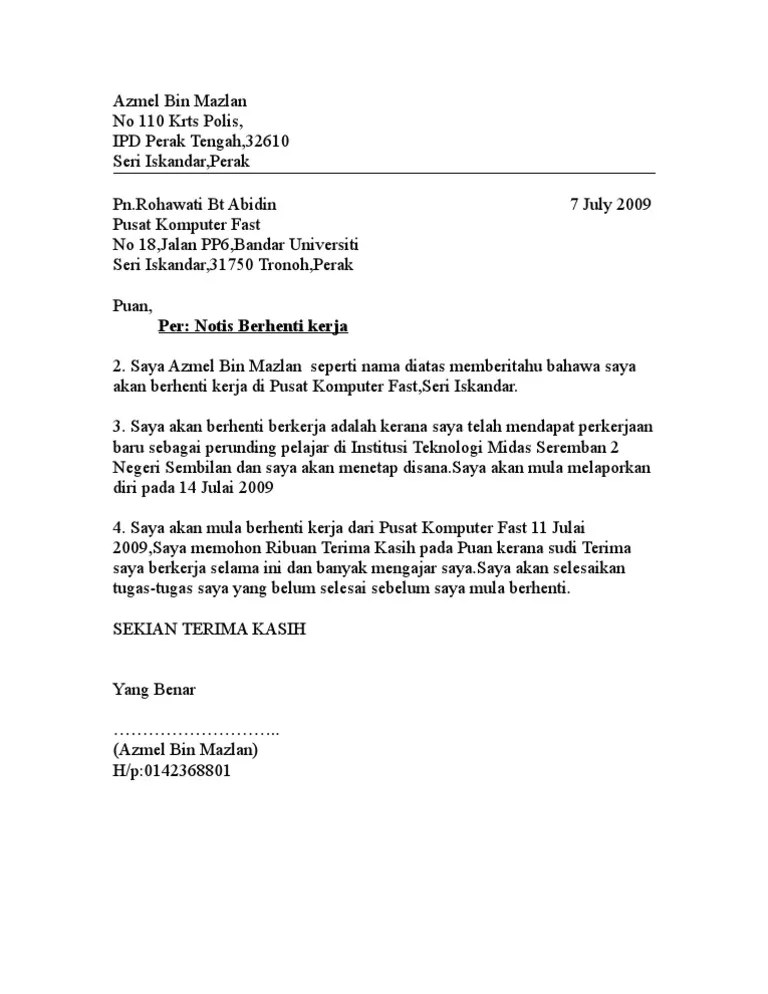 No4, kg tebuk, sungai kob, 09700 karangan, kedah darul aman. Download contoh surat berhenti kerja notis sebulan. Ahmad farhan bin ahmad fuad. Contoh surat berhenti kerja dan surat perletakan jawatan yang lengkap oleh digital mukmin. Contoh surat rasmi berhenti kerja notis sebulan.